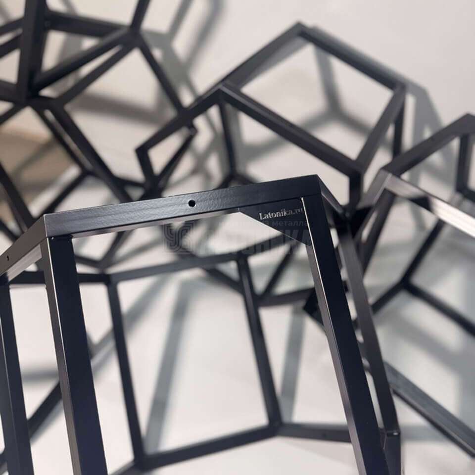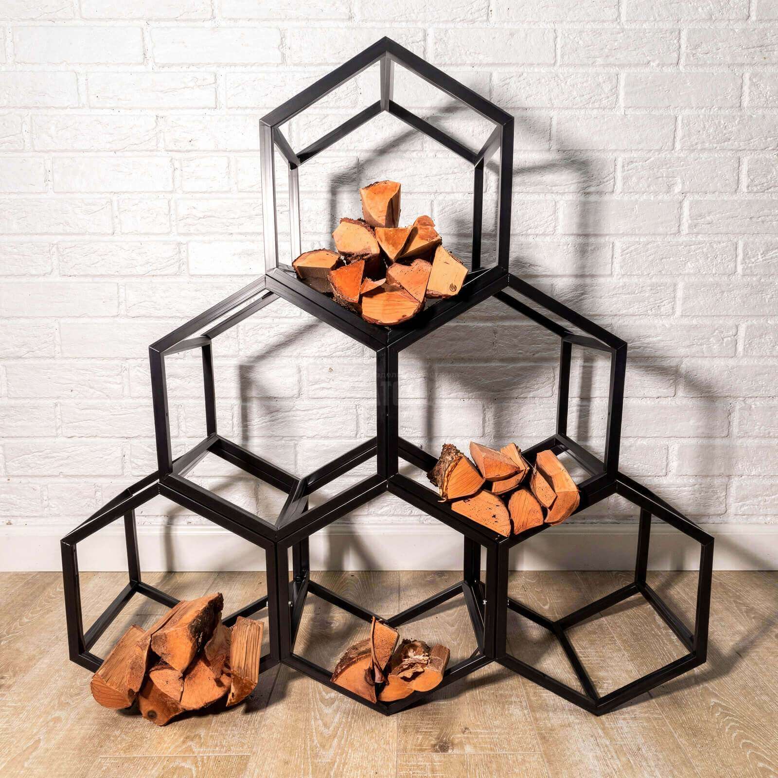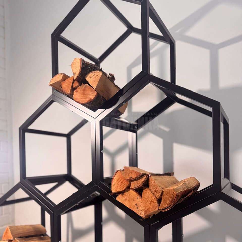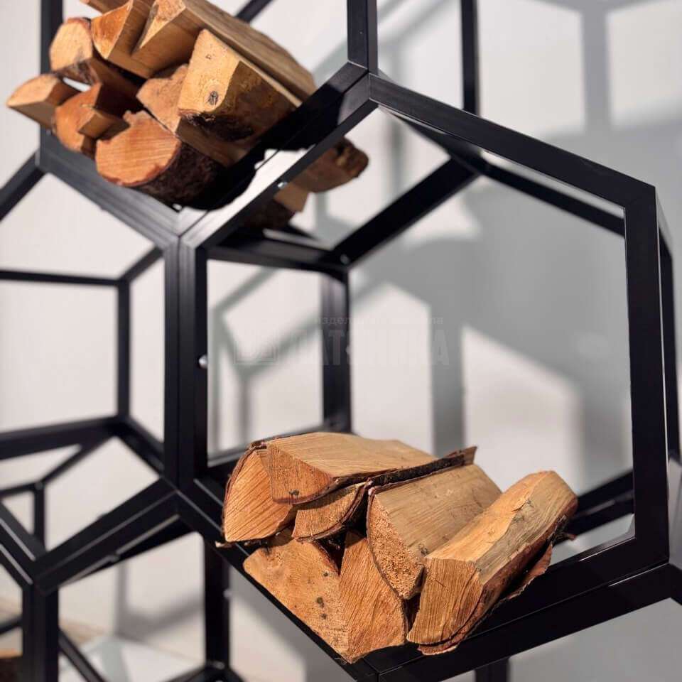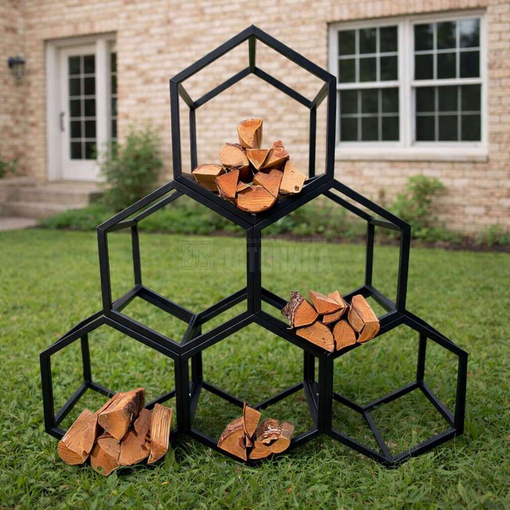 Современная модульная дровница «Геометрия» выполнена из стального профиля с шестиугольными ячейками. Каркас собран в динамичную композицию, удобно делит поленья по размерам и превращает хранение дров в аккуратный, выразительный акцент пространства. Порошковое покрытие в матовом чёрном обеспечивает стойкость к истиранию и влаге, а конструкция легко масштабируется: мы изготавливаем дровницы в любой конфигурации и цвете по палитре RAL, под конкретные габариты и стиль интерьера или террасы.