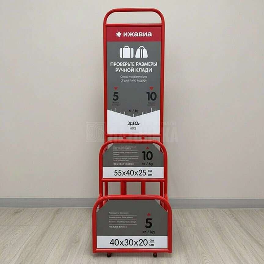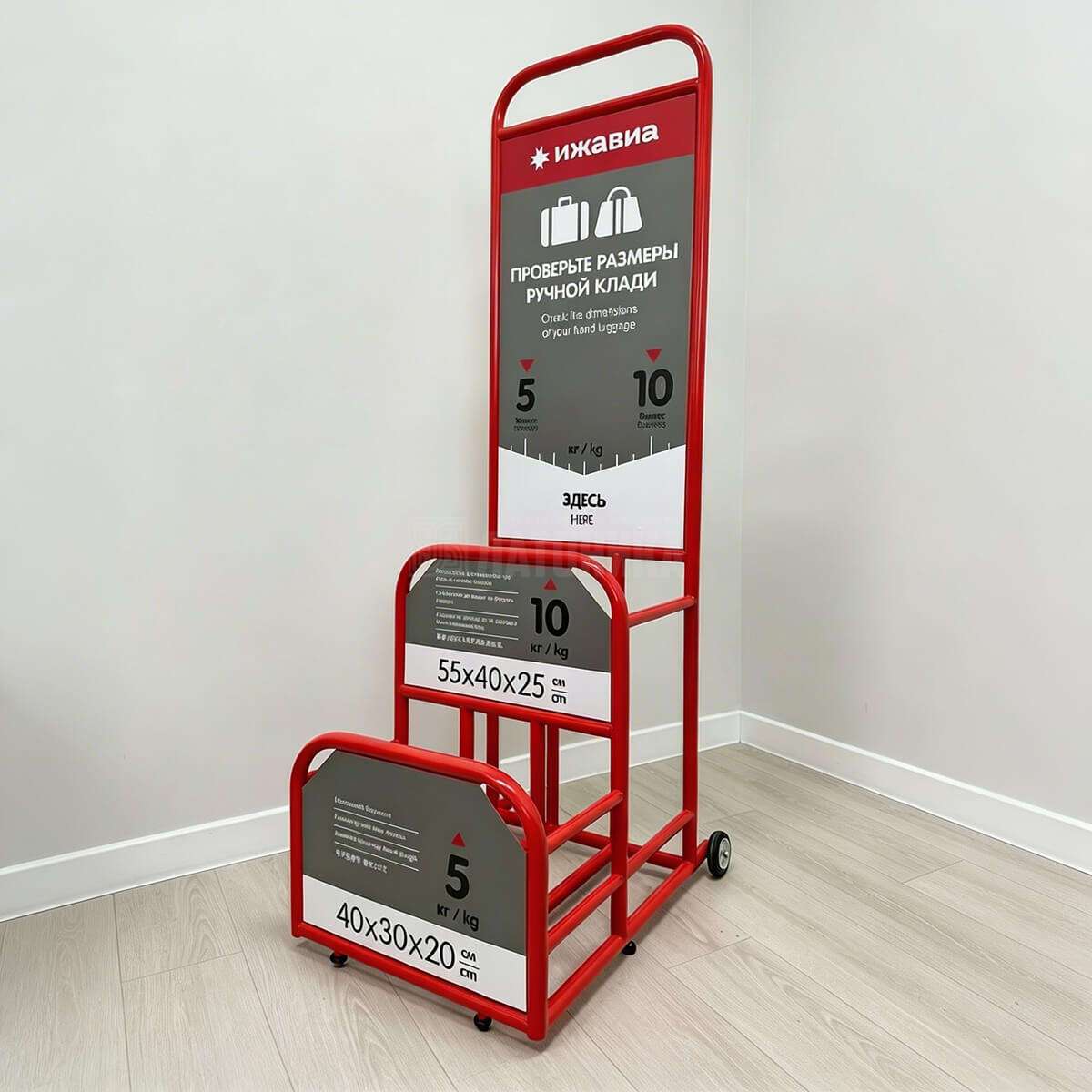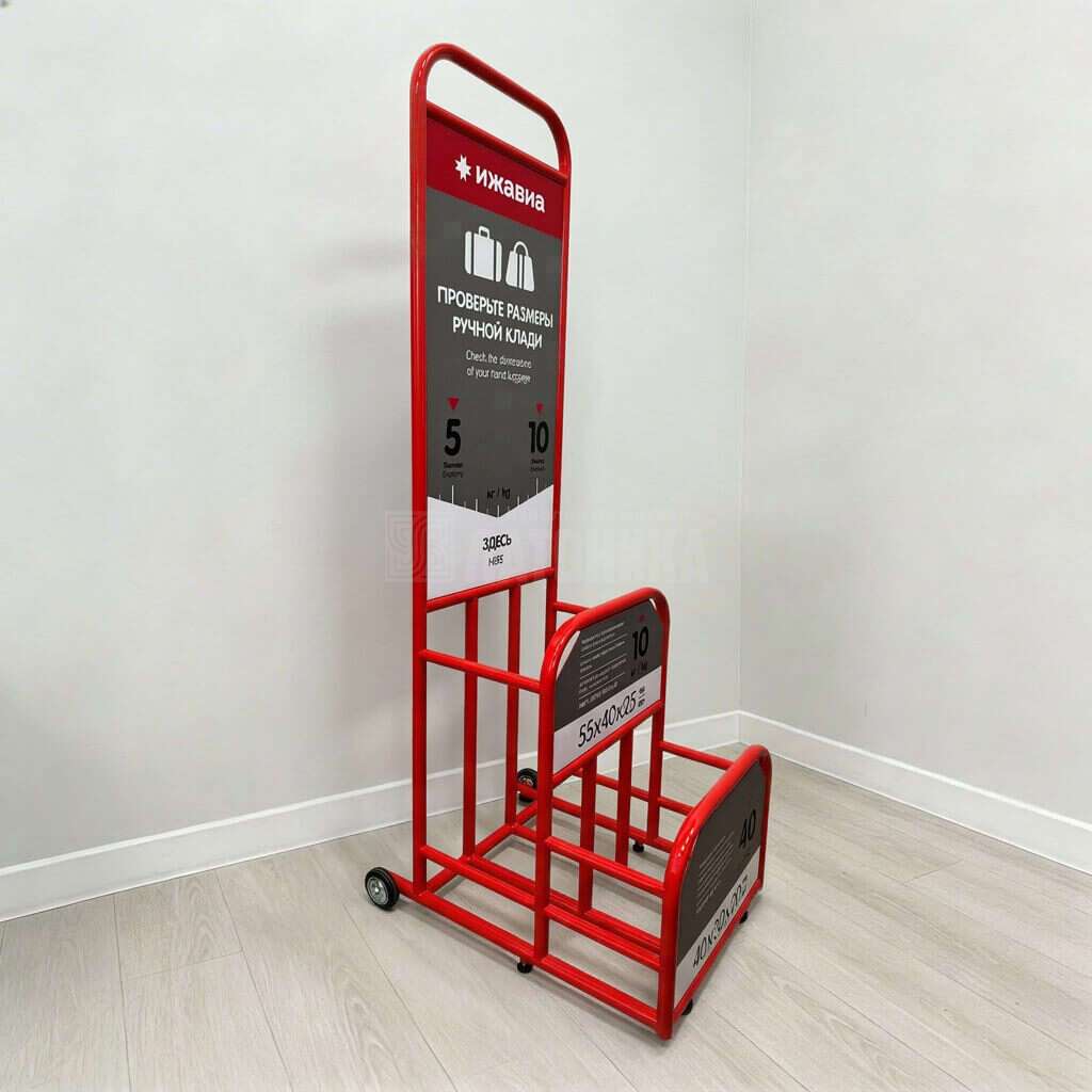 Стойка для измерения ручной клади в аэропорту. Окрашена порошковой краской в фирменный цвет авиакомпании. Стойка изготовлена по индивидуальным размерам с учетом фирменного стиля для авиакомпании Ижавиа.