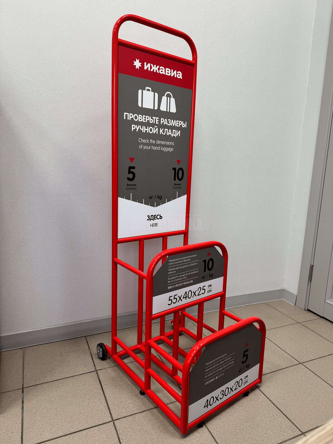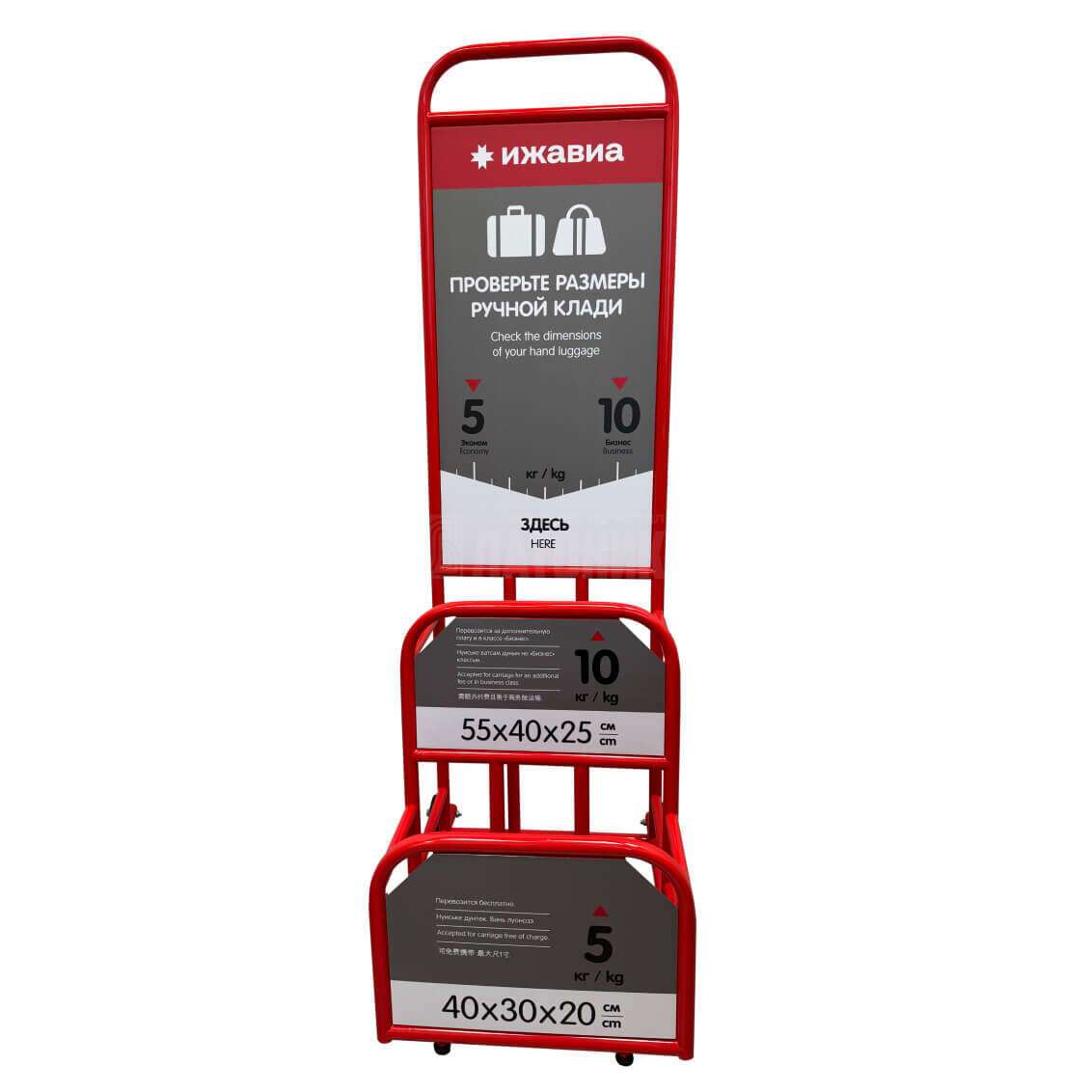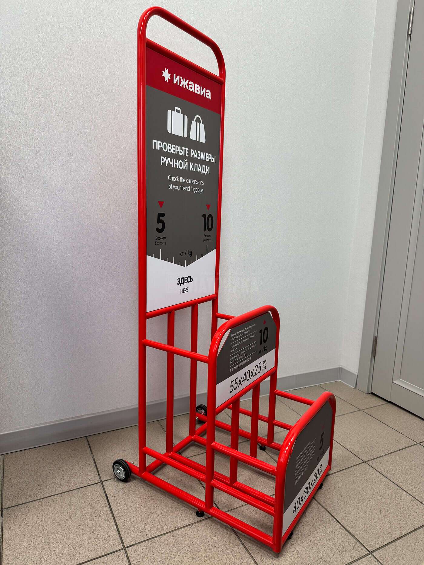 Стойка для измерения ручной клади в аэропорту. Окрашена порошковой краской в фирменный цвет авиакомпании. Стойка изготовлена по индивидуальным размерам с учетом фирменного стиля для авиакомпании Ижавиа.