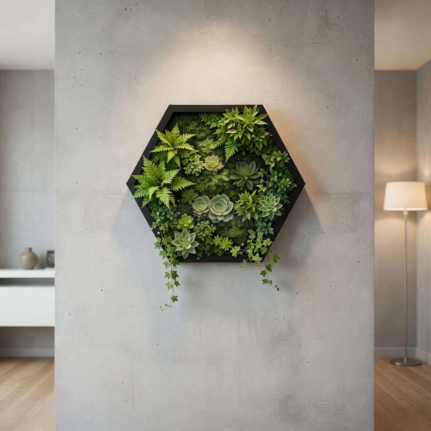 Металлическое панно «Измерения» - компактный арт‑борд для вертикального озеленения и настенного декора. Жесткий шестигранный каркас с ровной геометрией обеспечивает аккуратную посадку мха, суккулентов и декоративных элементов. Модель выполнена в черном цвете с порошковым покрытием, размер 600×520×50 мм. Идеальный акцент для современных интерьеров и витрин.