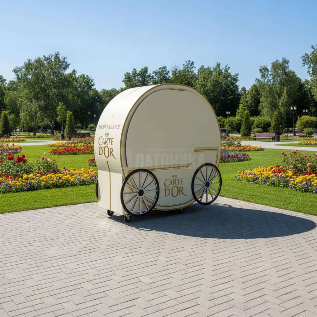 Передвижной металлический киоск для продажи мороженого «Карета» станет эффектным и практичным решением для уличной торговли и промо активностей бренда. Конструкция производится под заказ по вашим размерам, легко перемещается на площадке и обеспечивает удобную работу продавца с сохранением чистоты и порядка. Металлический каркас устойчив к ежедневной нагрузке, а порошковая окраска придает аккуратный премиальный вид и защищает поверхность в условиях улицы и ТРК. Киоск стилизуется под фирменный бренд и помогает создать запоминаемую точку контакта с покупателями.