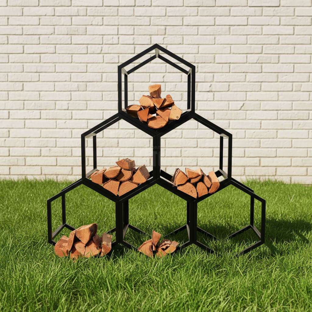 Современная дровница из металлического профиля с ячейками в виде объемных сот. Подходит для дров у камина, печи или уличной зоны барбекю. Лаконичный черный каркас превращает хранение поленьев в стильный акцент интерьера или террасы.