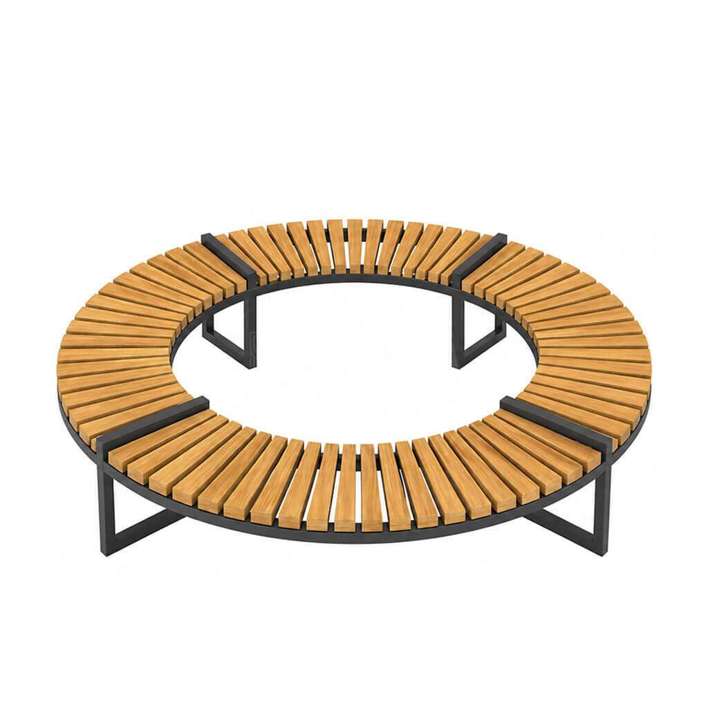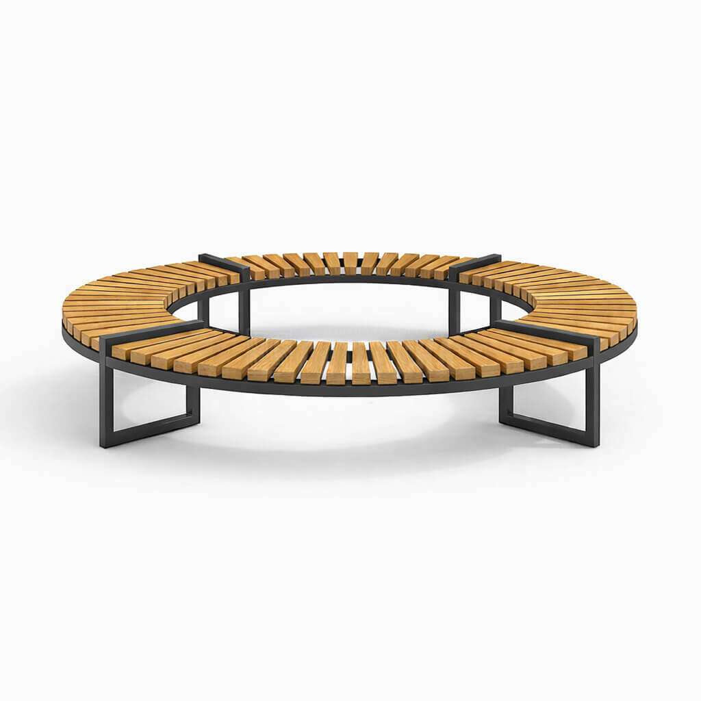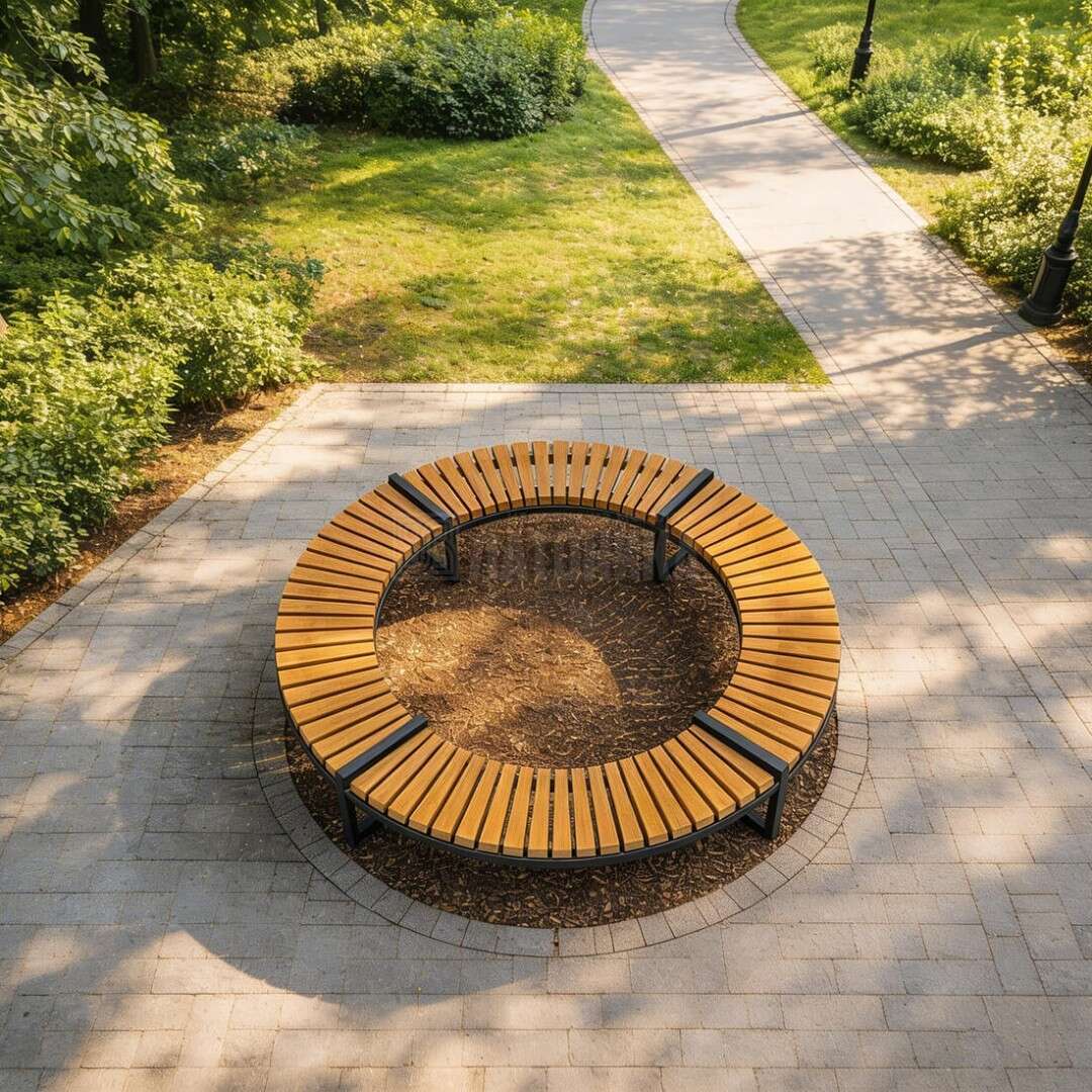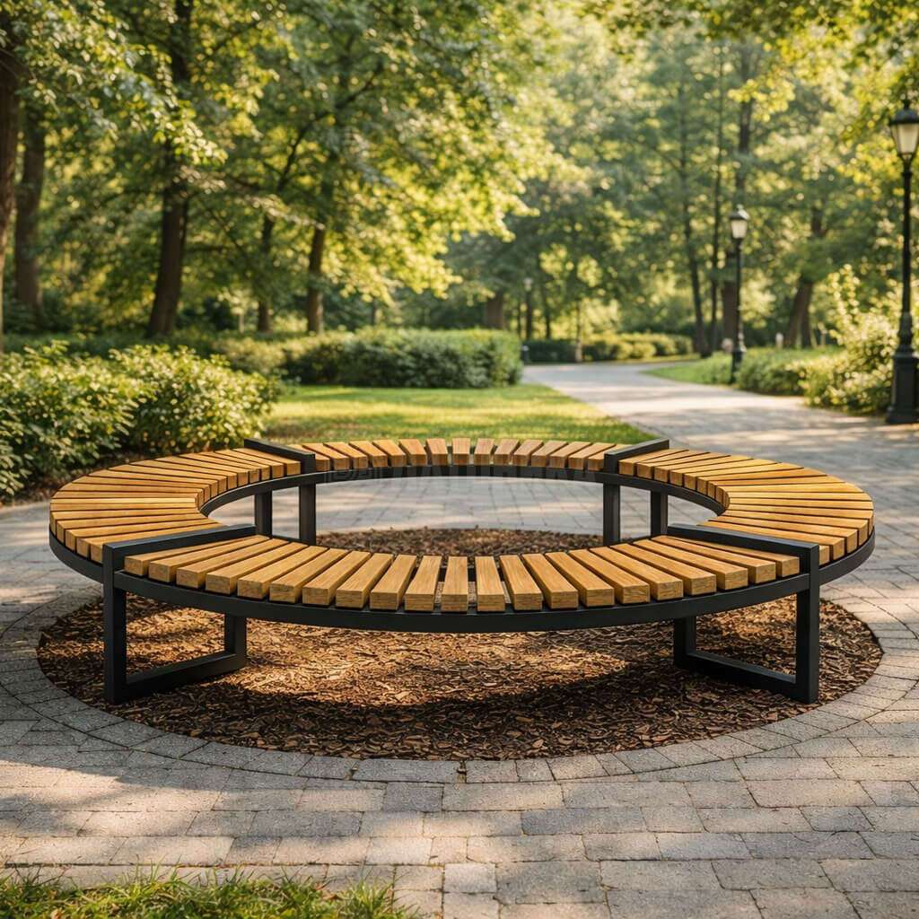 - Круговая форма, которая делает лавочку заметным центральным элементом благоустройства