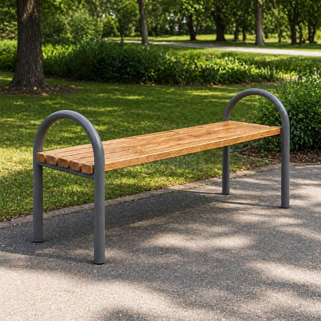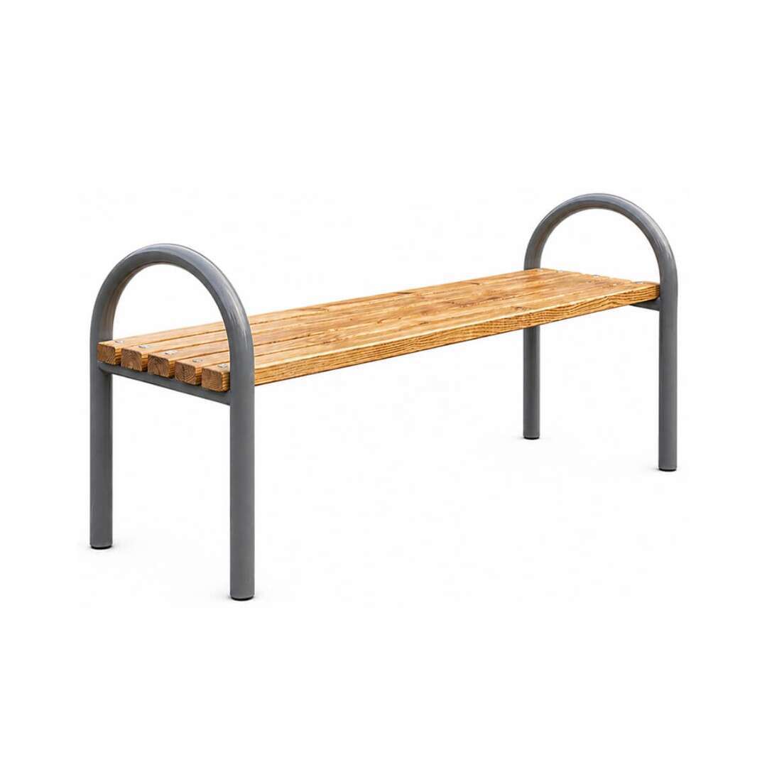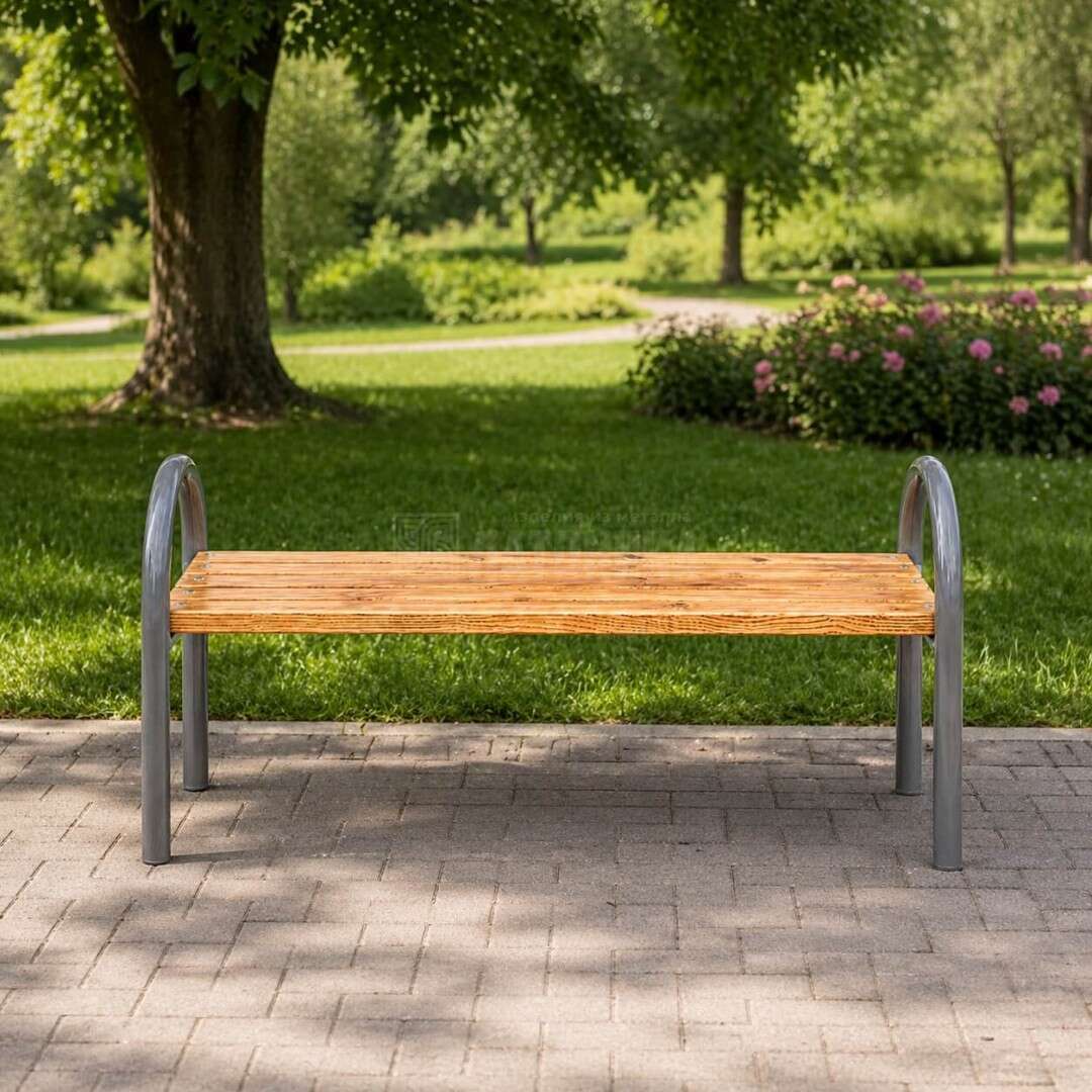 Модель хорошо подходит для парков, скверов, дворов, частных участков, входных зон и коммерческих территорий. Металлический каркас обеспечивает прочность и устойчивость к ежедневной эксплуатации, а деревянное сиденье можно выполнить из сосны или лиственницы в зависимости от бюджета, стиля и условий использования.