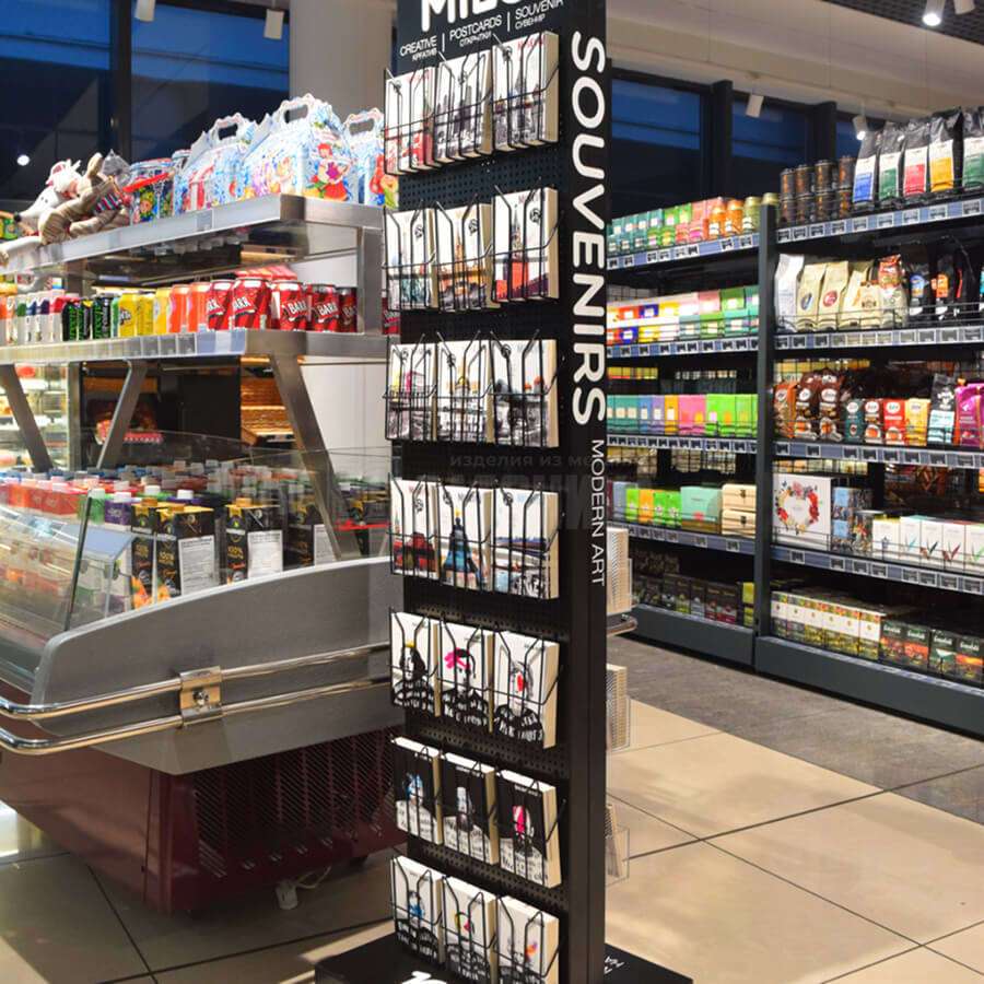 Торговая стойка для магнитов и открыток произведена на заказ по индивидуальным размерам. Порошковая покраска и нанесение фирменной символики.